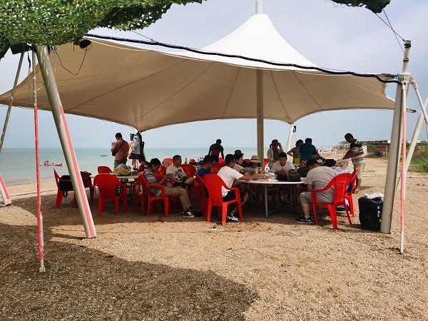 說來也怪,前一天后一天都是大到暴雨天氣,只有8月14日是難得的好天氣。海濱浴場管理人員為我們安排了遮陽的大涼亭。大家迫不及待的支起燒烤爐子,看著雞翅由白色漸漸變成金黃色,聽著羊肉、羊排上的油掉到炭火上發(fā)出“滋啦滋啦”的聲音,聞著香辛料和食物飄出的陣陣香味,不禁讓人食指大動。